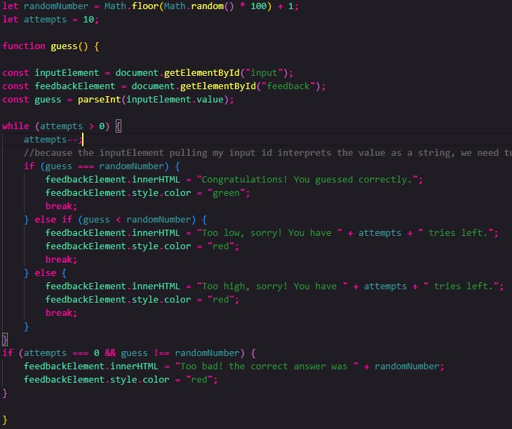 This page showcases the use of while loops and if statements, as well as the decrement function, parseInt and break statements. I used all of these statements, operators and expressions to build the below guessing game.